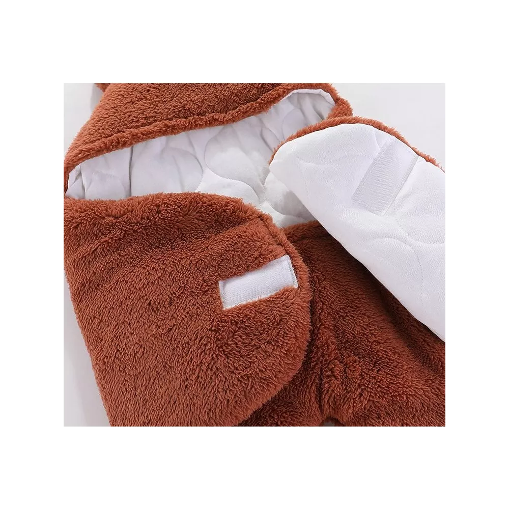 Kombinezon ma praktyczny krój typu rożek, który umożliwia łatwe i szybkie zawinięcie dziecka. Zapięcie na rzep (Velcro) ułatwia zakładanie oraz dopasowanie do ciała maluszka, gwarantując bezpieczeństwo i stabilność bez uciskania. Całość uzupełnia kapturek z uroczymi uszkami, który chroni główkę przed chłodem, jednocześnie dodając stylowego uroku.