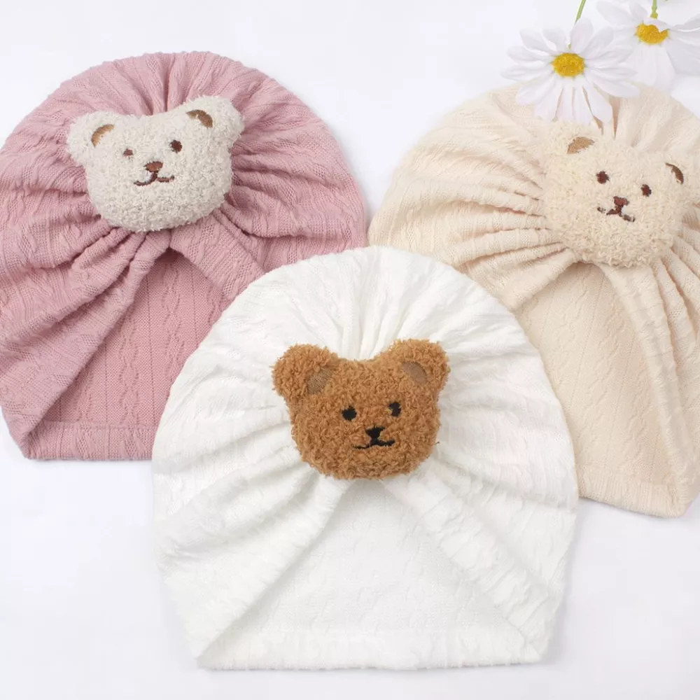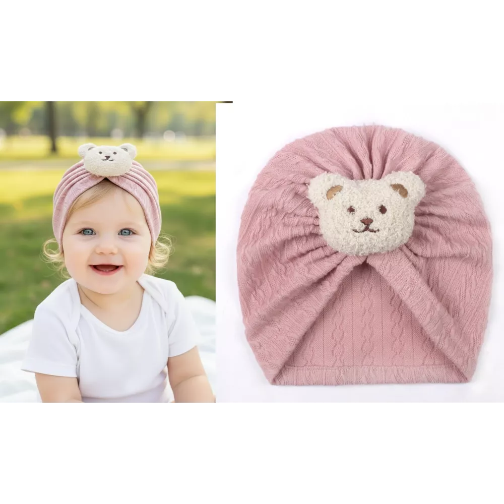 Urocza czapka turban dla niemowląt z pluszowym misiem – idealna na każdą porę roku.
