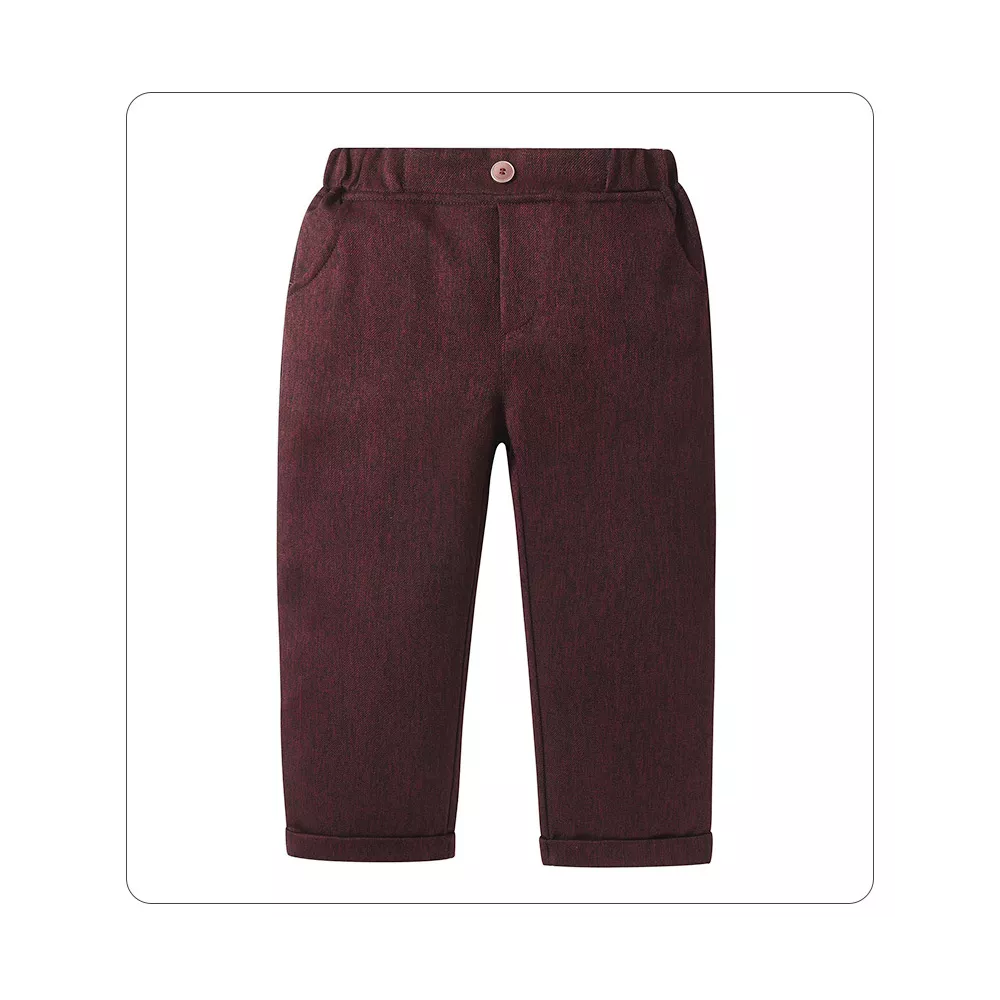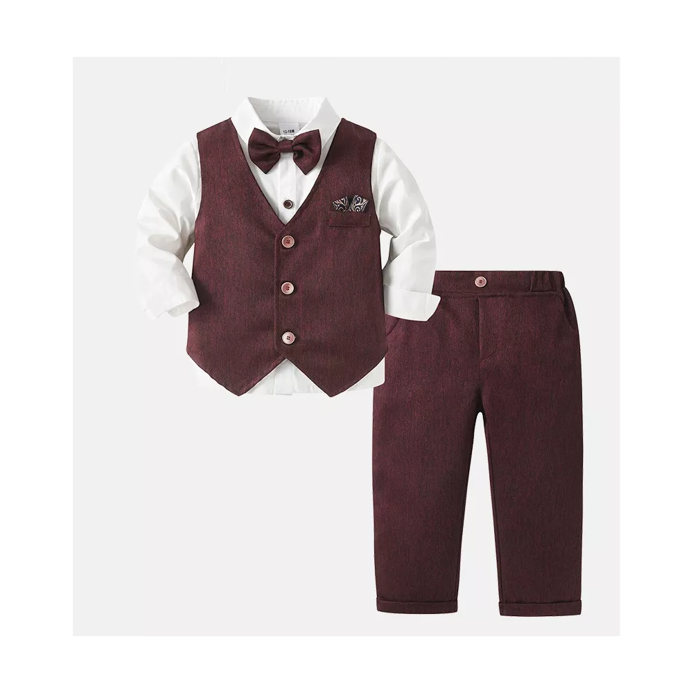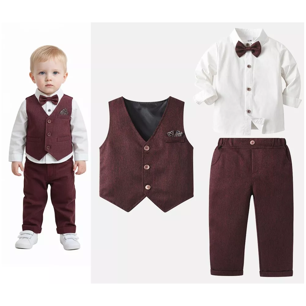 Stylowy, komfortowy i idealny na uroczystości – elegancki 4-częściowy garnitur chłopięcy w bordowym kolorze, wykonany z trwałego poliestru, sprawdzi się na wesela, święta oraz sesje zdjęciowe.