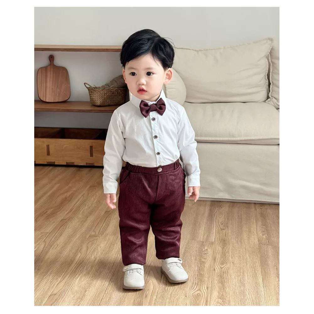 Koszula w zestawie została wykonana z miękkiego i przewiewnego materiału, co gwarantuje wygodę nawet podczas długiego noszenia. Klasyczny kołnierzyk oraz elegancka muszka w kolorze bordowym idealnie dopełniają całość, sprawiając, że stylizacja nabiera wyjątkowego charakteru. Koszula jest zapinana na guziki, co ułatwia ubieranie i rozbieranie malucha.