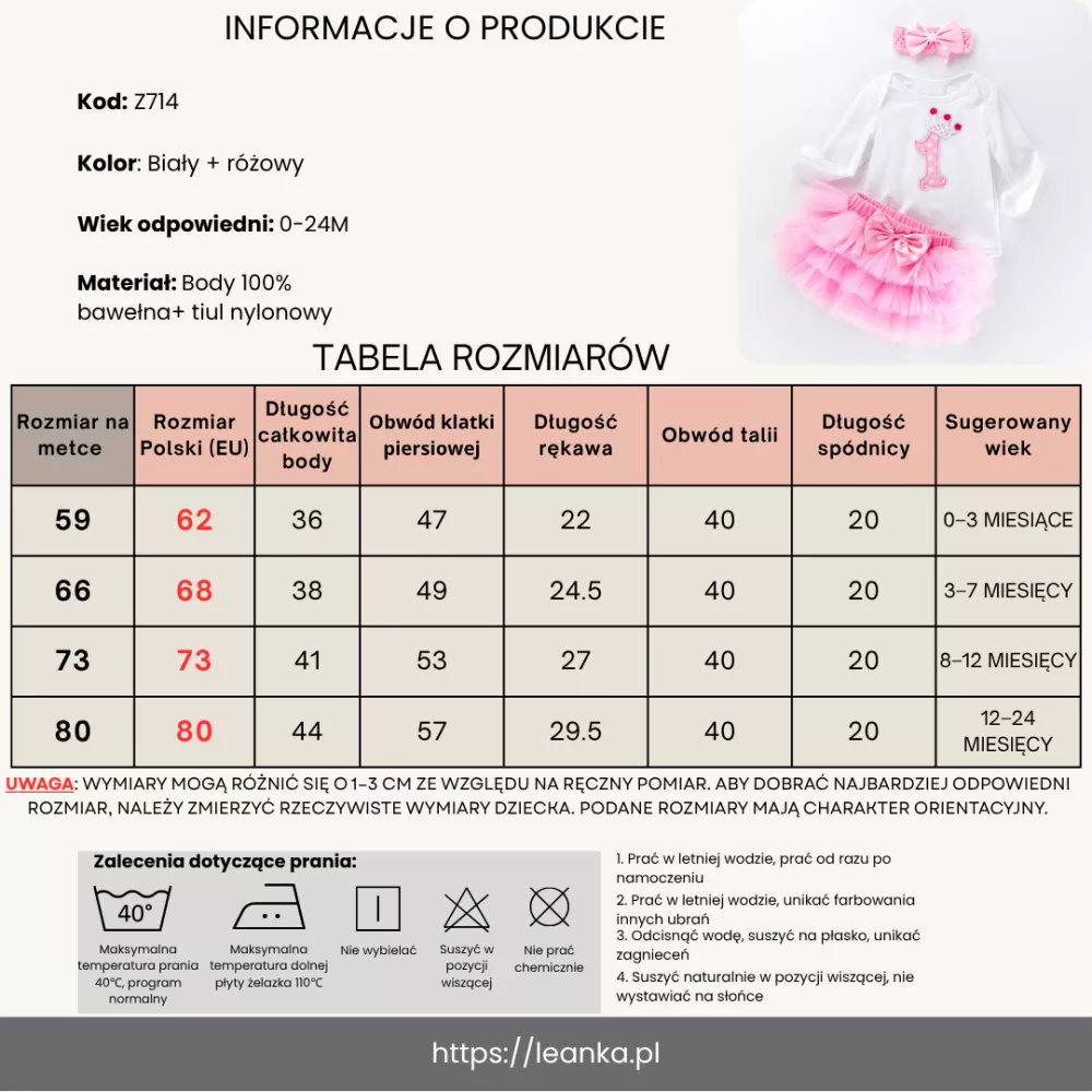 Zestaw zawiera: body z nadrukiem „1”, tiulową spódniczkę, opaskę z kokardką