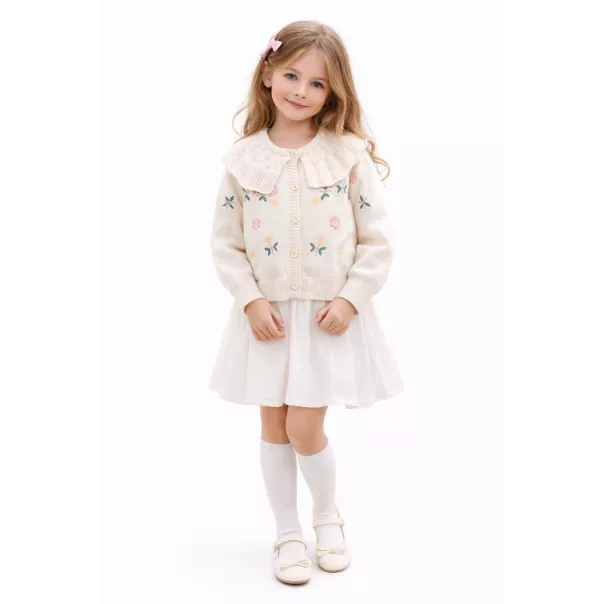 Stylowy sweterek dla dziewczynki z haftem kwiatowym i delikatnym kołnierzem, idealny na co dzień i wyjątkowe okazje.