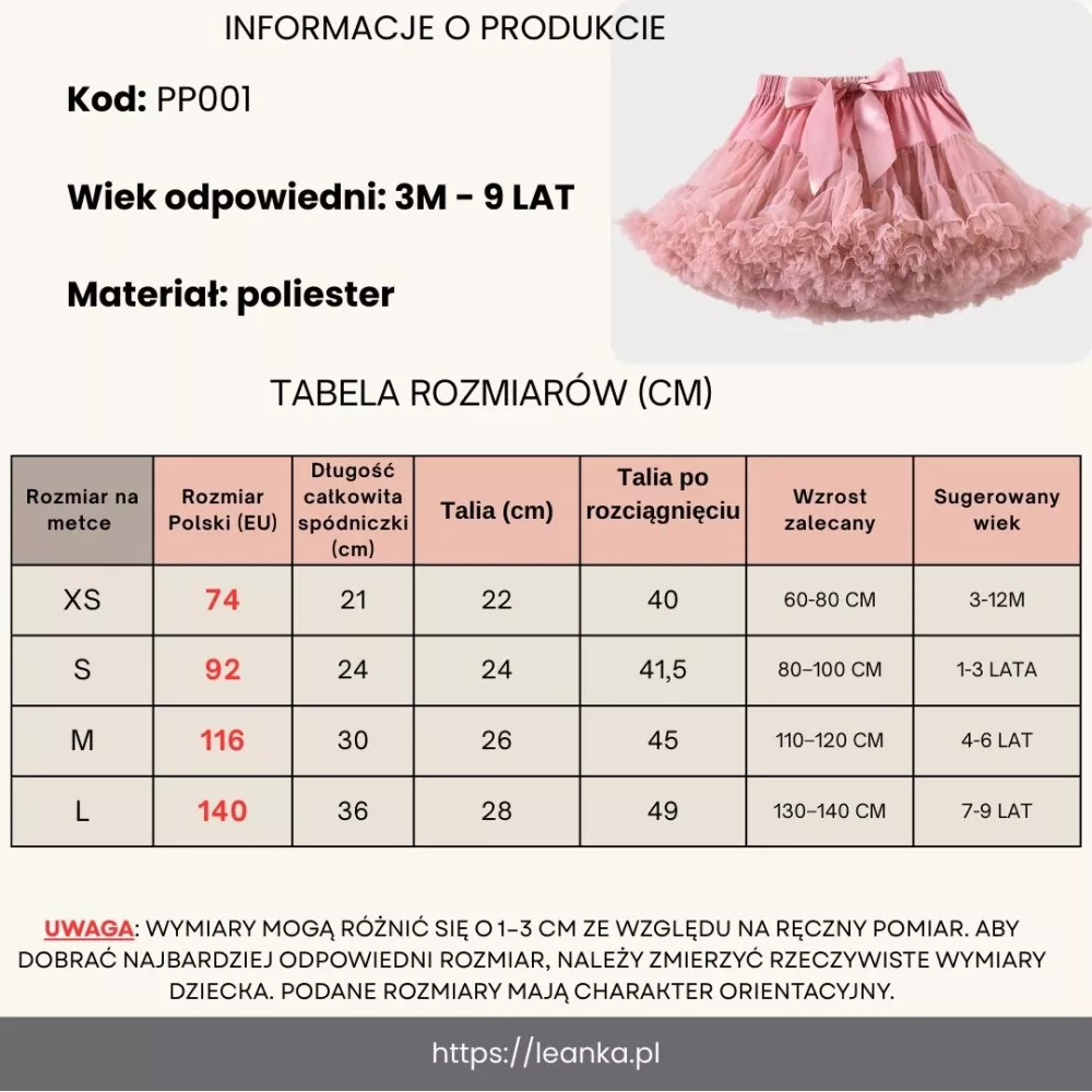 Dół spódniczki składa się z puszystych, marszczonych falbanek, które nadają jej charakteru tutu premium. Materiały użyte do produkcji są miękkie, lekkie i bezpieczne dla delikatnej skóry dziecka. Dzięki temu spódniczka sprawdzi się zarówno w stylizacjach zimowych (z rajstopami i sweterkiem), jak i w sezonie wiosennym lub jesiennym.
