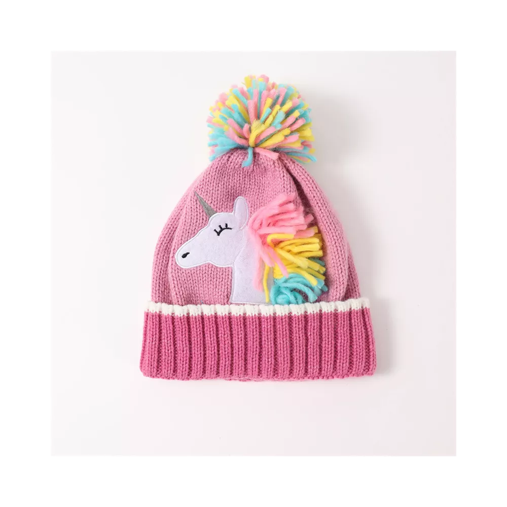 Uroczy komplet zimowy dla dziewczynki – ciepła czapka z pomponem i rękawiczki w kolorze różowym, ozdobione motywem jednorożca.